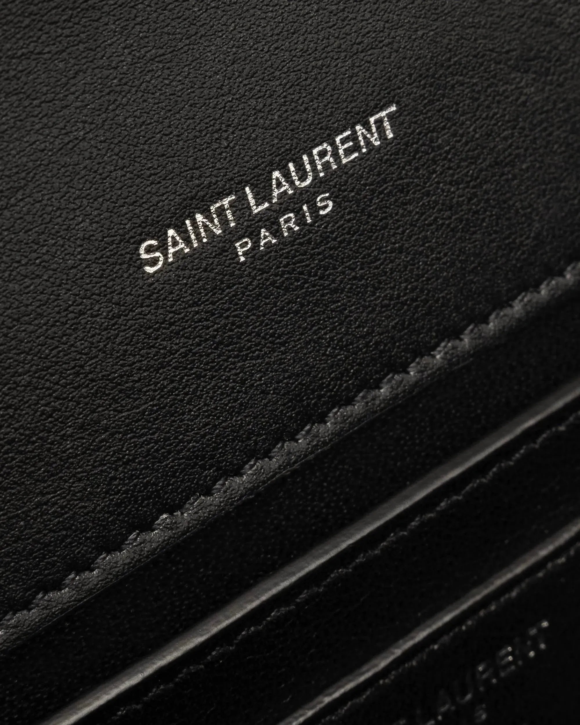 Black leather crossbody bag with silver tone hardware and engraved Saint Laurent logo.