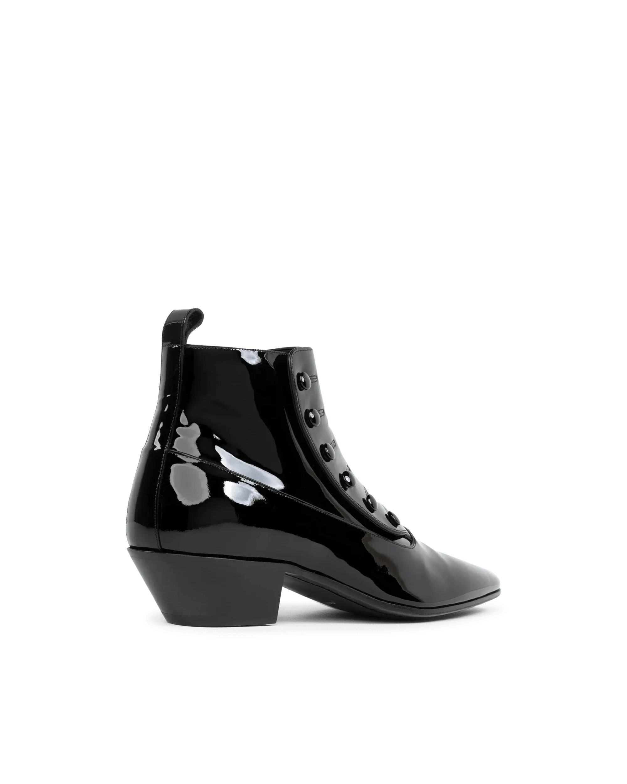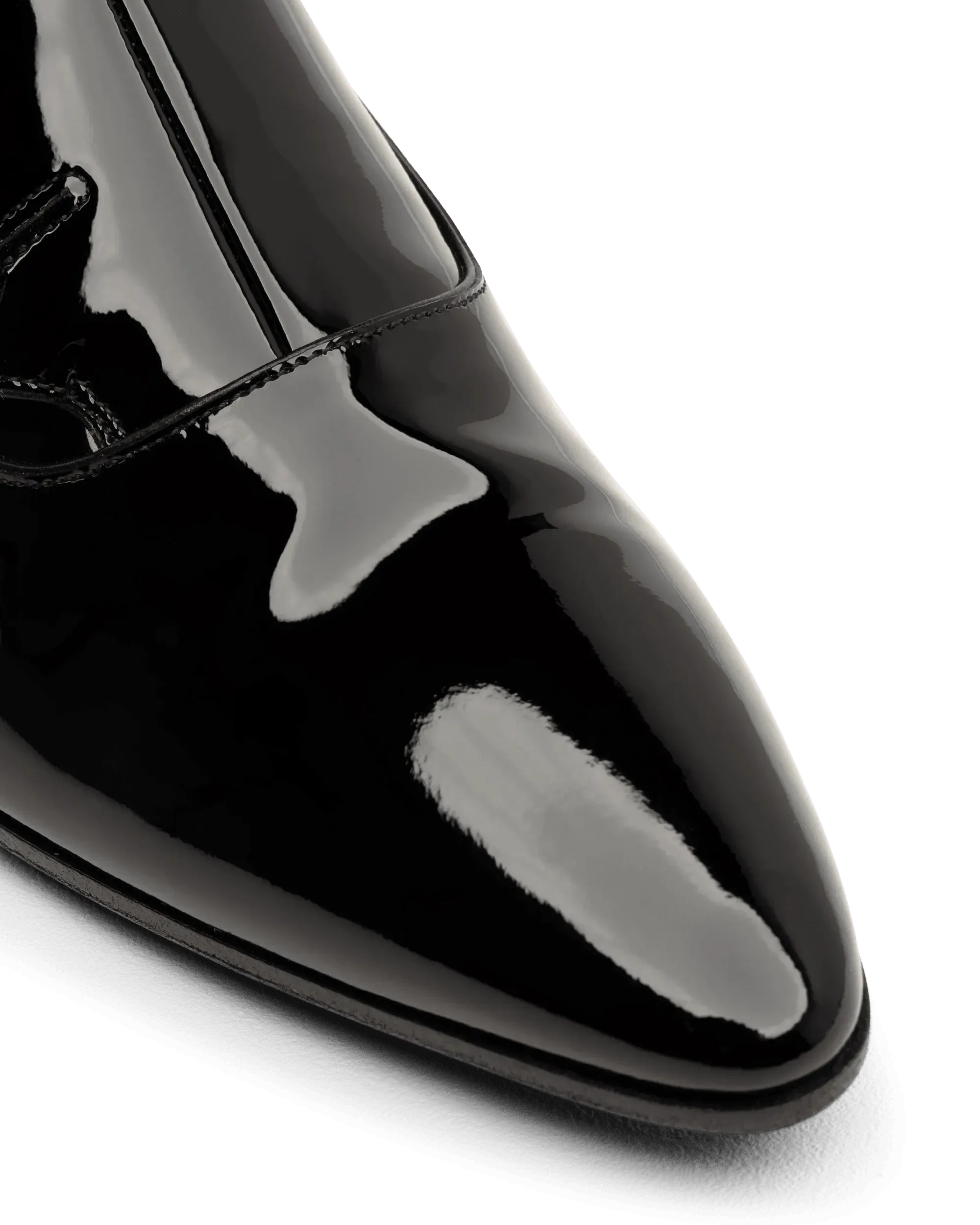 Patent leather angle block heel with a pointed toe and short zip fastening.
