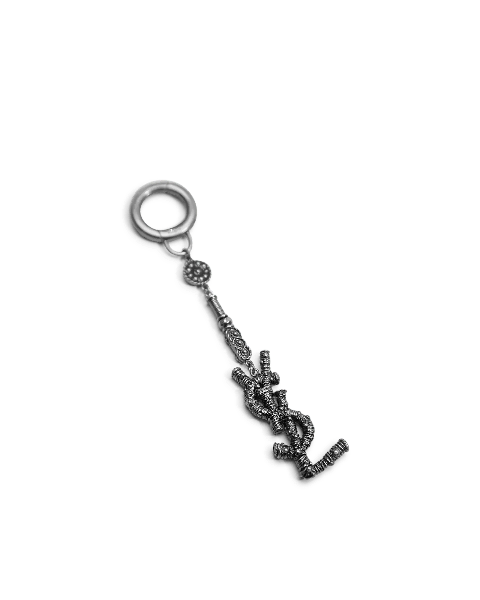 Sliver plated YSL logo plaque with single key ring and floral details.