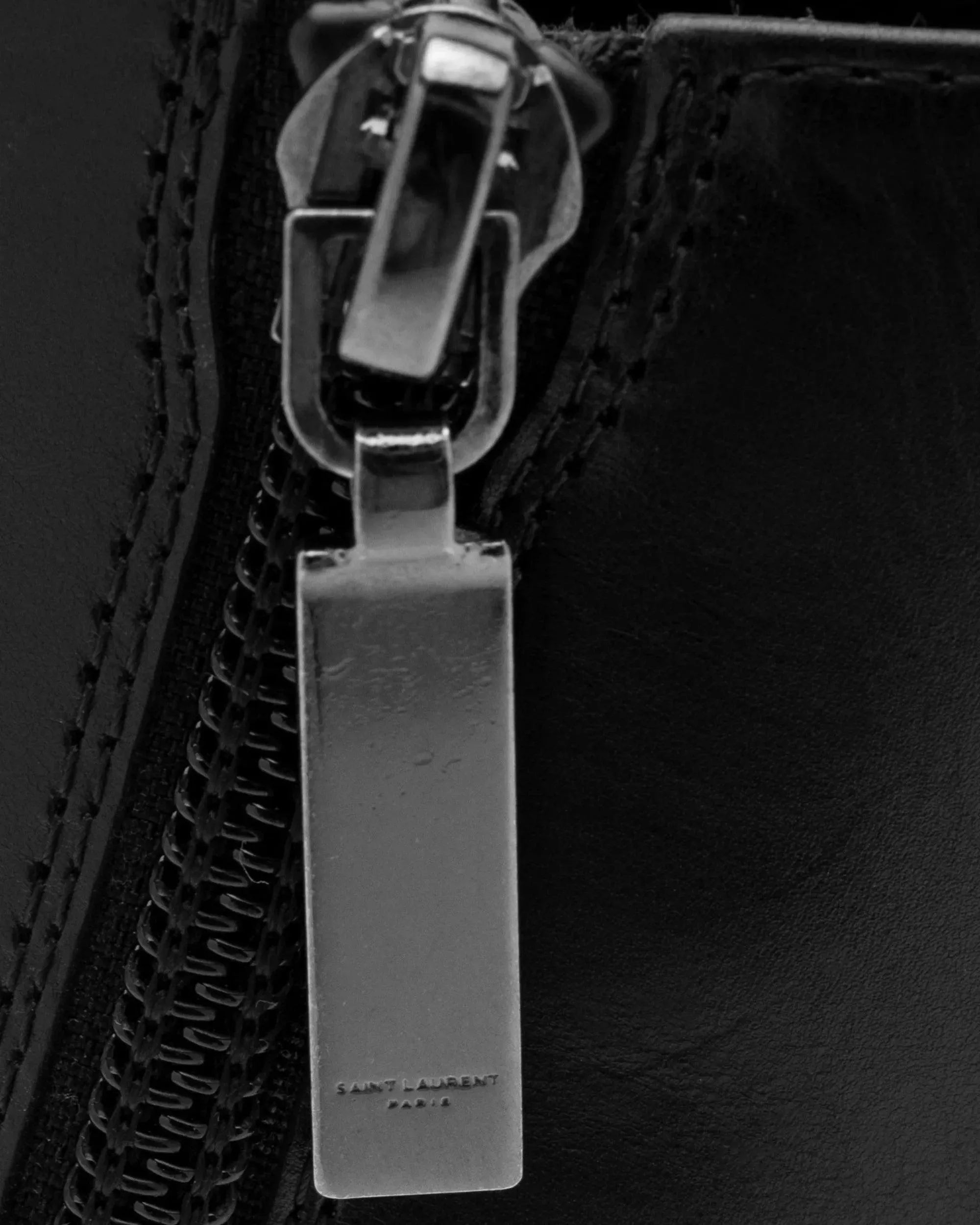 Black leather almond toe block heel ankle boots with side zipper closure.