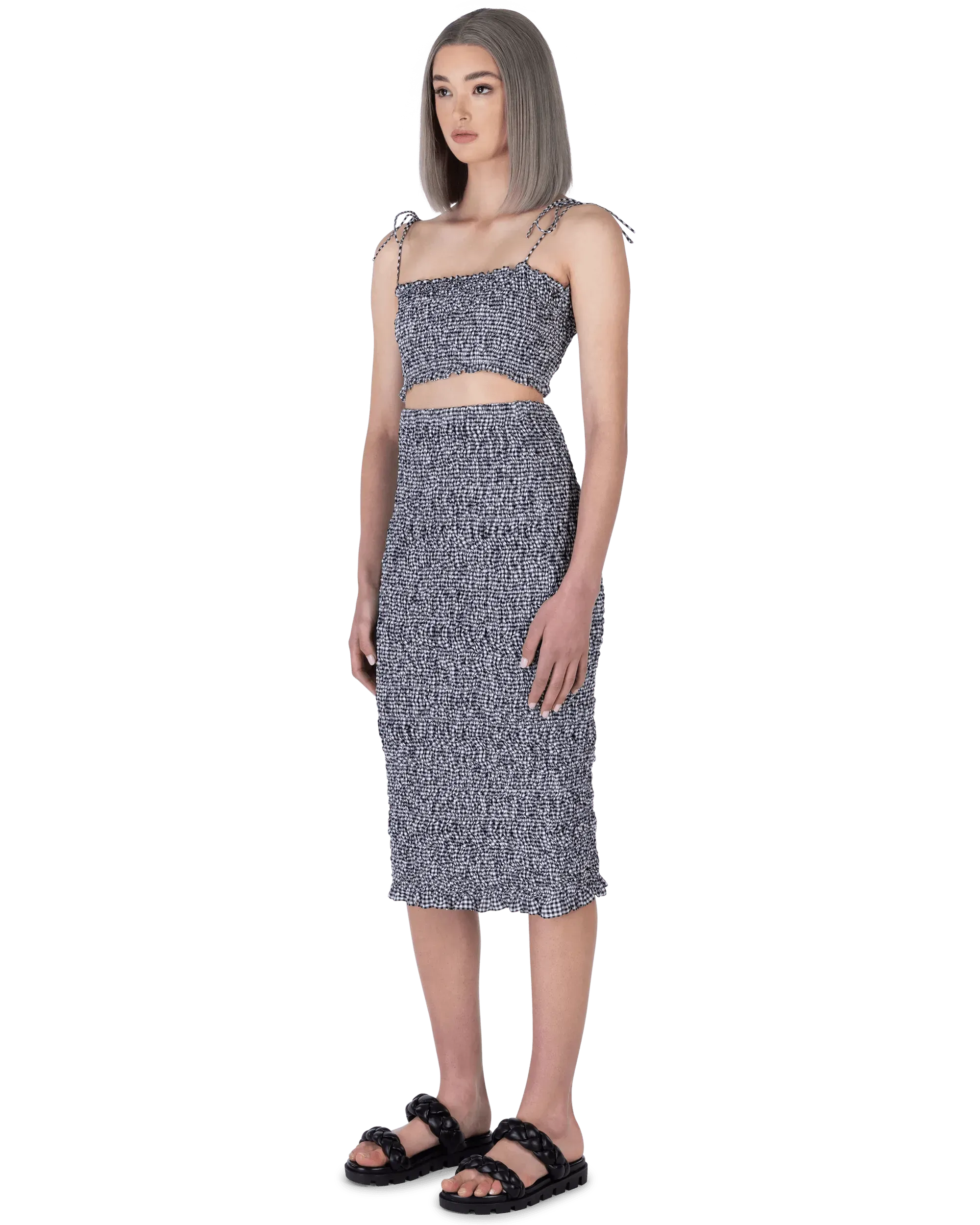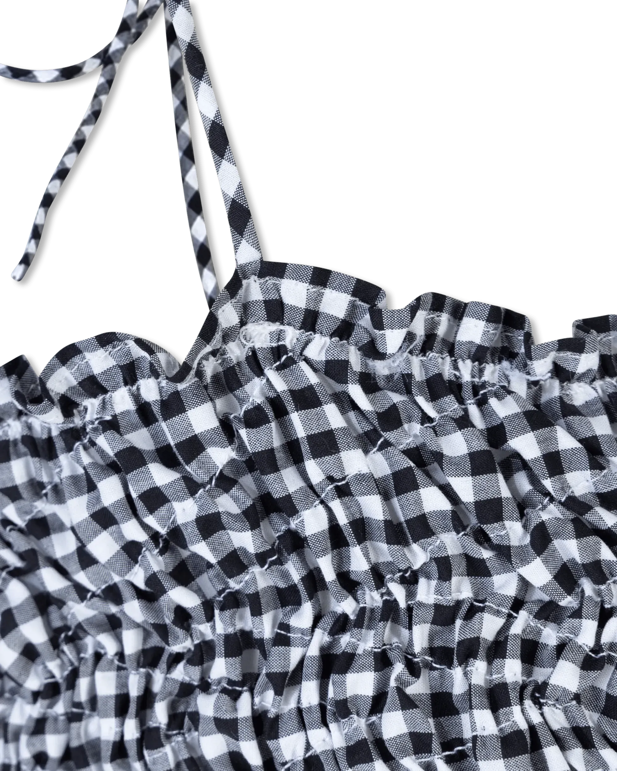 Black and white gingham patterned cotton cropped top with spaghetti straps and tie closure.